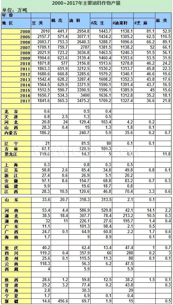 權(quán)威發(fā)布!2000年~2017年油料作物產(chǎn)量信息匯總表(含具體地區(qū))